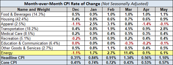 Here is a table showing the annualized change in Headline and Core CPI, not seasonally adjusted, for each of the past six months. Also included are the eight components of Headline CPI and a separate entry for Energy, which is a collection of sub-indexes in Housing and Transportation.