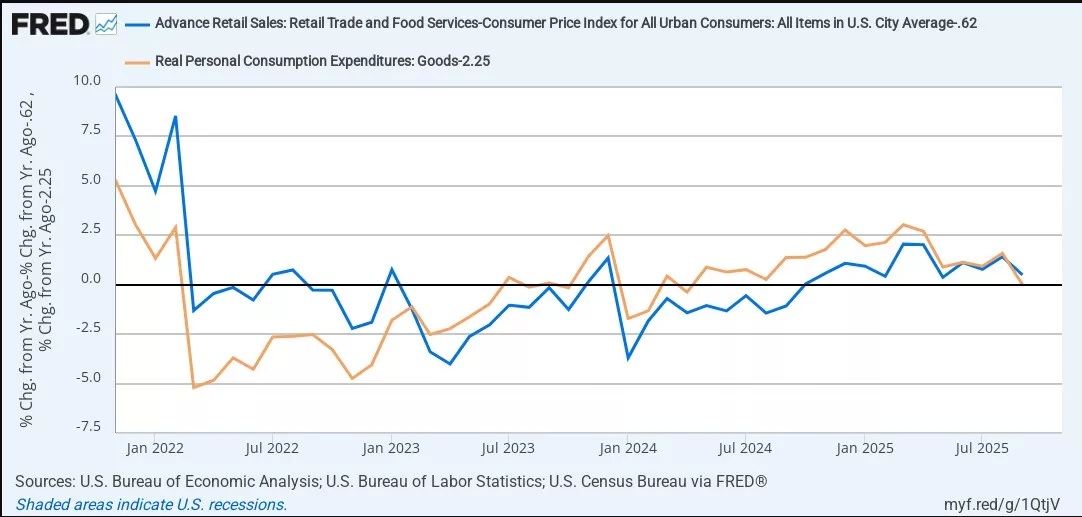 Real retail sales are more problematic, in part because there was no number for October, and November’s reading was marred by the shutdown kludge, particularly for shelter. With those important caveats noted, in November, real retail sales were higher by 0.3% compared with September, and up 0.6% YoY. The below graph, through September, shows YoY real retail sales (blue) and the similar measure of real spending on goods (gold ), with the most recent reading of each subtracted so that it =0: