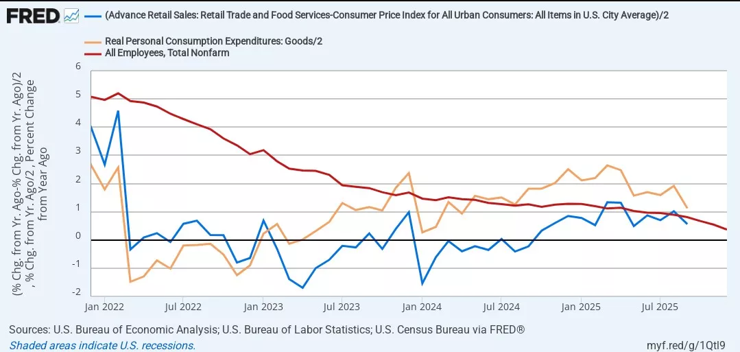 If you believe, as I do, that the shutdown shelter kludge removed about 0.2% from consumer inflation, that becomes a tiny 0.4% increase YoY, the smallest such gain since October 2024. Also, recall that real personal spending has not been updated yet beyond September.