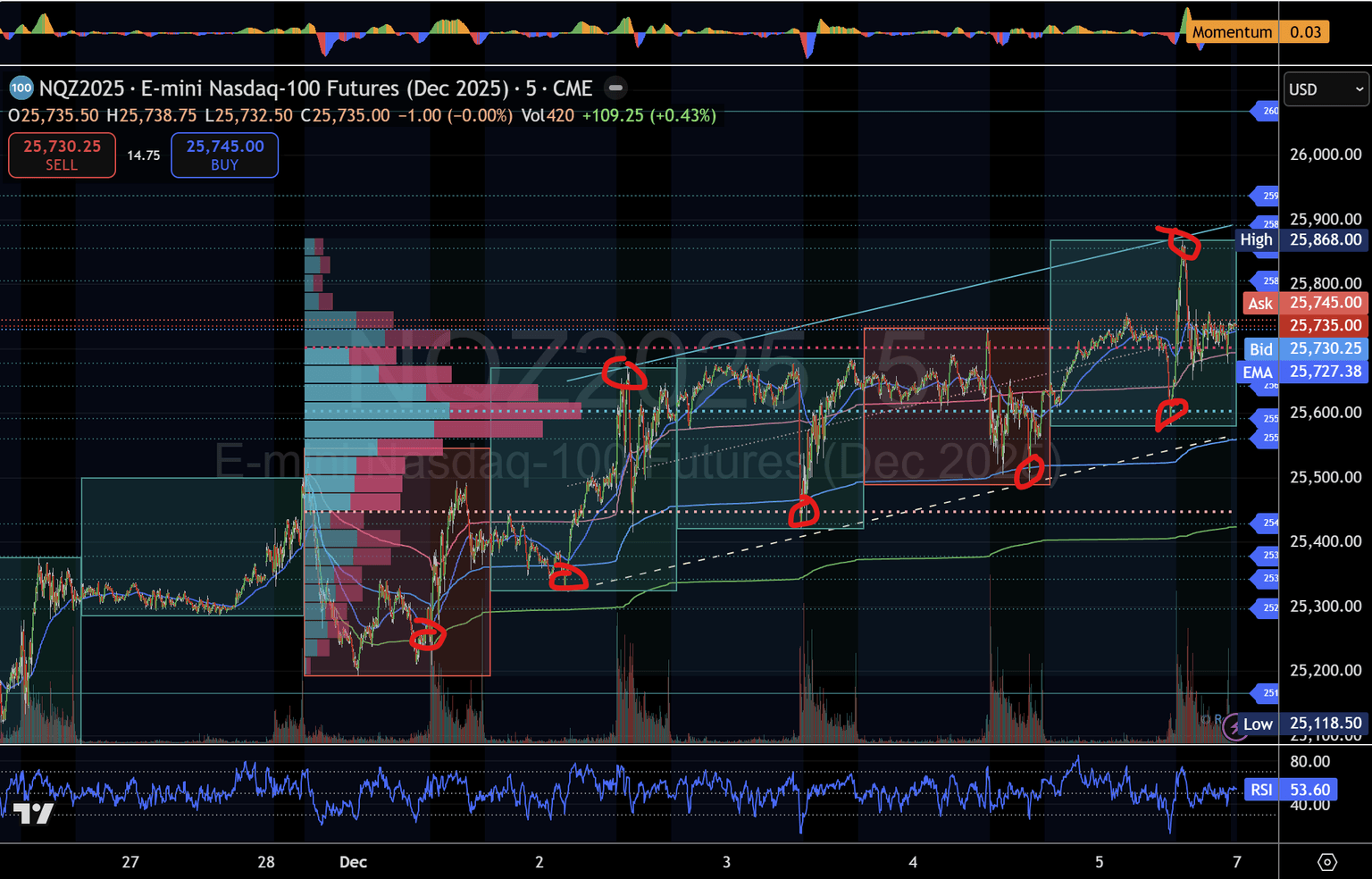 At Friday's open, Nasdaq futures pulled back into the middle structure near the 25,591 mark, where buyers stepped in decisively, forming another clean high-low rotation. This confirmed the middle zone as the intraday trend's central pivot.