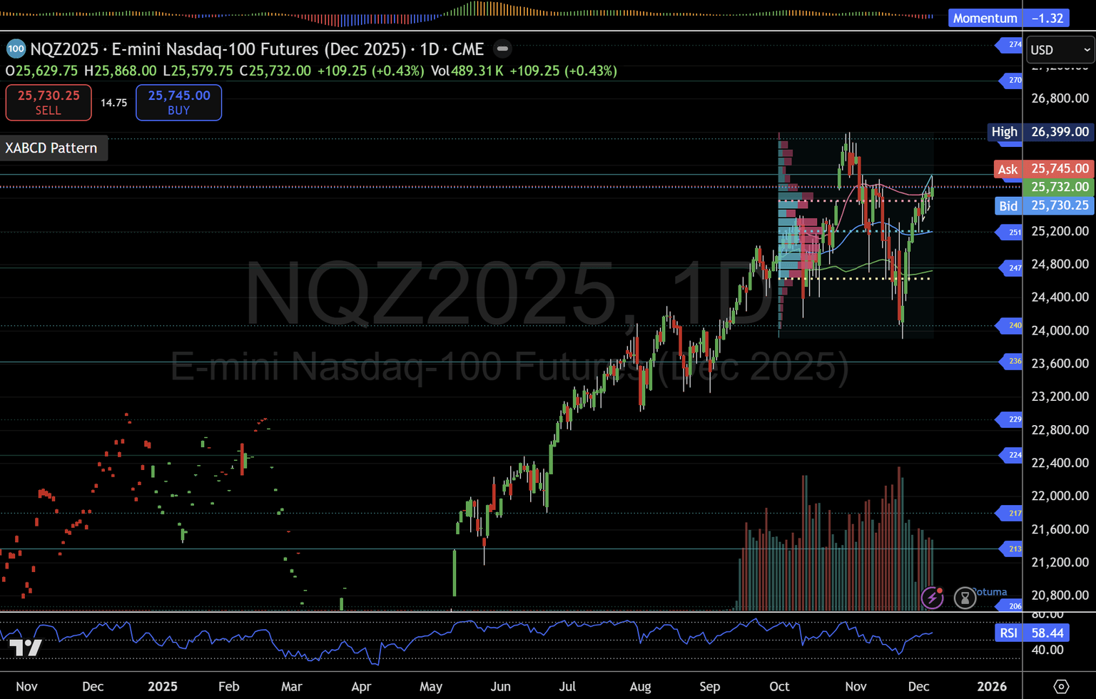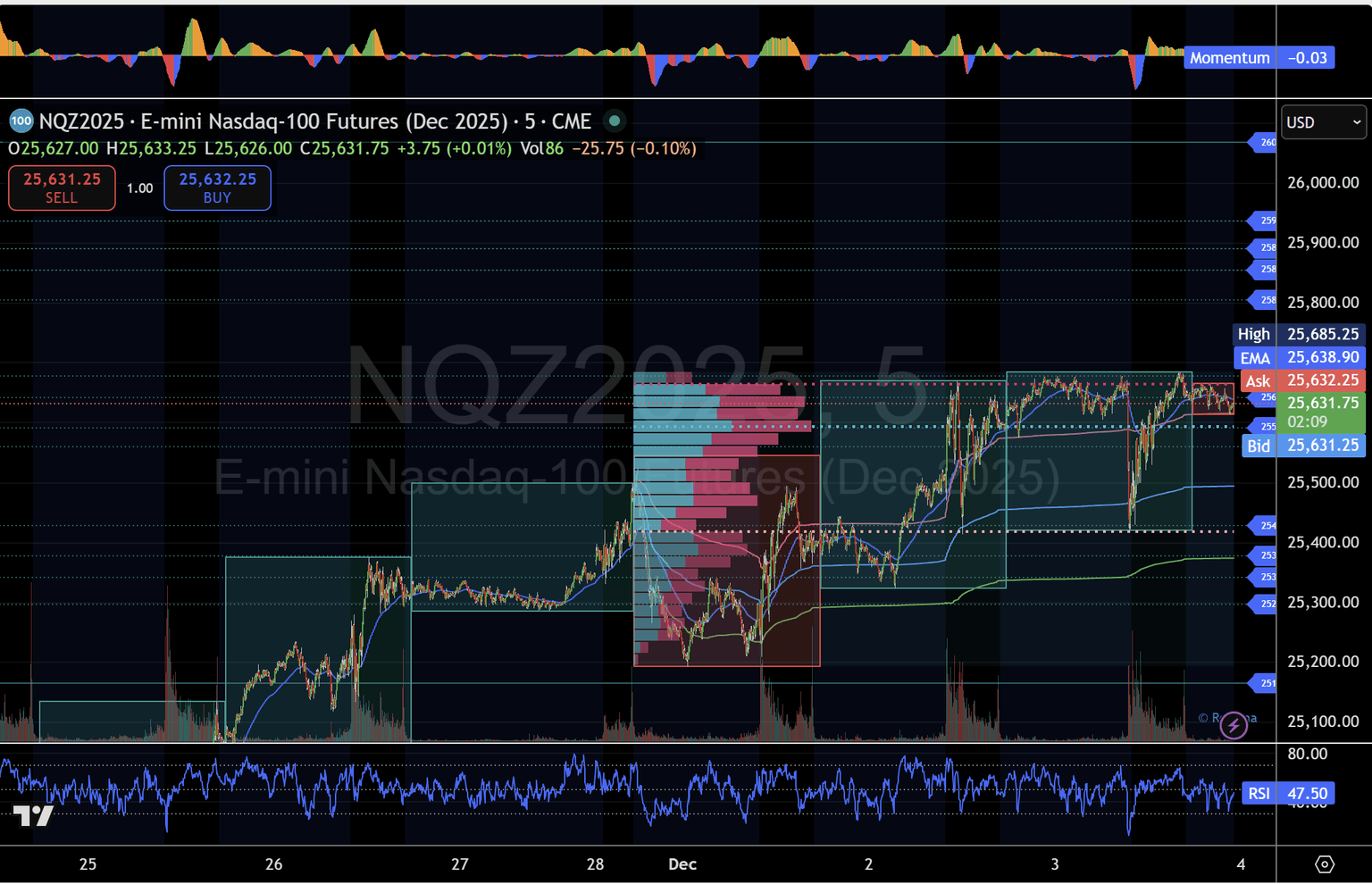 On the higher timeframe, Friday's close held above the value area high at 25,575, aligning with the high-volume trading footprint seen throughout early to mid-November. This structural support seemed to suggest continued price action at these levels, which would keep the bullish case intact.