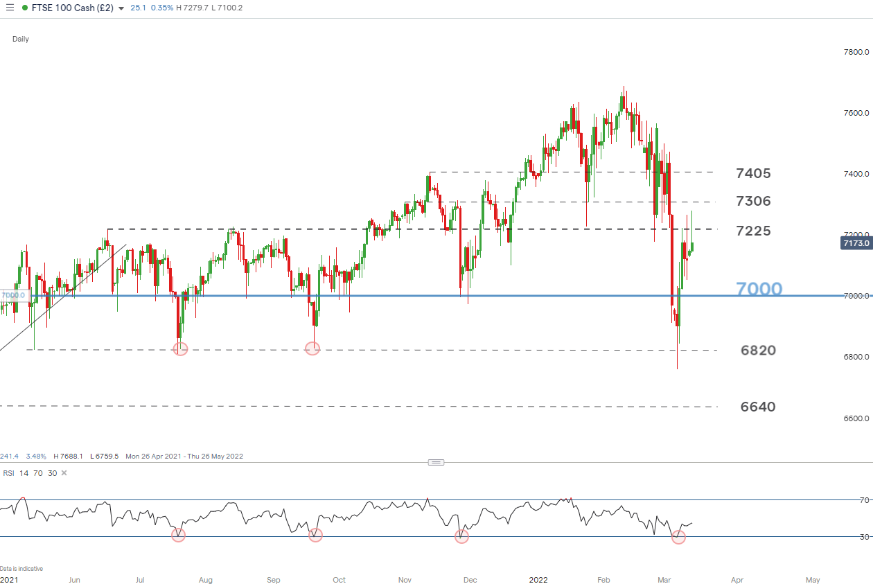 Looking at the FTSE chart, the RSI has proven rather reliable in preceding bullish reversals but has not had the same effect when it comes to bearish reversals, meaning levels of resistance may provide a better idea of when short term bullish momentum may slow down. For example, today and Friday we witnessed price action trade well above 7225 only to retrace back below it. Ending the day below 7225 suggests that this is a level that bears find attractive, pushing prices towards the psychological level at 7000. However, a break and hold above 7225, opens the door to the bullish continuation with 7306 and 7405 the next levels of resistance.
