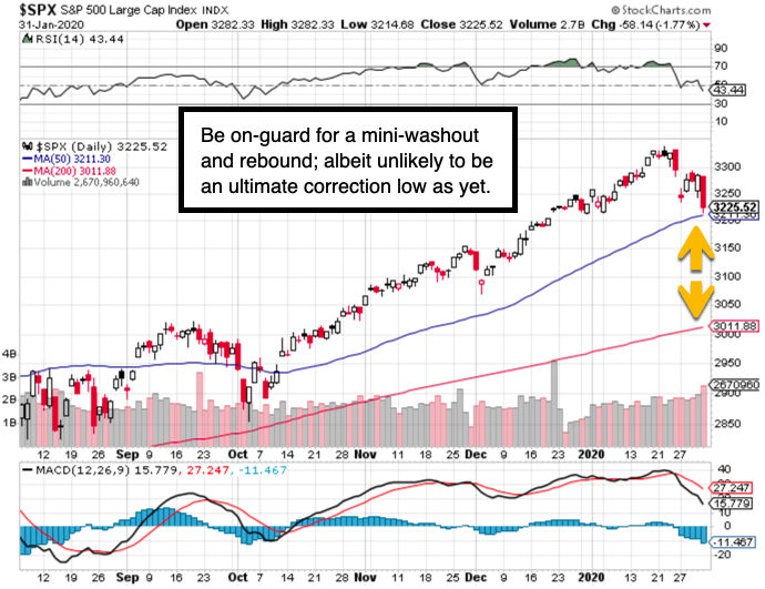 While WuFlu (my term for the Wuhan coronavirus) frenetic liquidations of course are at the heart of current actions (relegating Impeachment almost to the sidelines of importance as to what matters to humanity), this was a decline we forecast to begin by mid-late January, extend into early-to-mid February (at a minimum), and ironically ahead of my talk about the stock market and reducing cardiovascular event risk too (that's a hybrid topic of my forthcoming February 8 talk at 3:30 pm at the Florida Money Show). I'll probably not wear a mask while talking, providing nobody coughs (!).