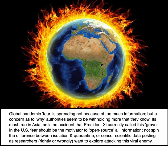 Avoiding market exposure with a buyer's strike Friday (I'd rather not say panic) amplifies the already ongoing setback we had projected, and I am glad we were able to forewarn that WuFlu greatly exceeded estimates in the early days, although of course I wish reports we had were wrong. It turns out they were not, so I thank both a friend in California that returned only 3 weeks ago (it was less than 2 weeks when I shared the warning), a respected doctor he knew in Shanghai had conveyed the information, as well as a military intelligence source noting certain stories were plausible.