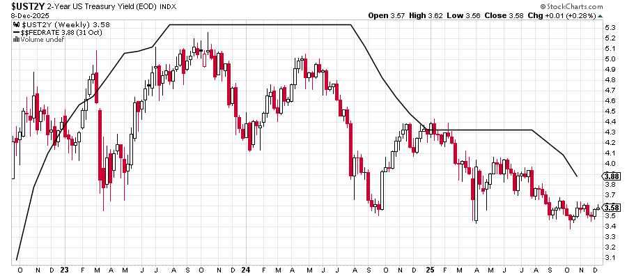 Below is my favorite and usually the most important chart when it comes to reading the Fed. The Fed Funds Rate follows the 2-Year Treasury. The 2-Year has been below the Fed Funds for almost all time since early 2023, which says the Fed is and has been overly restrictive. The market wants 1-2 more cuts sooner than later. My friend, Jim Paulsen, wrote a piece discussing how the bull market in stocks has been accompanied by the least accommodative policy in history, which is an excellent observation. It also says just how strong the bull has been without the Fed’s tailwind.