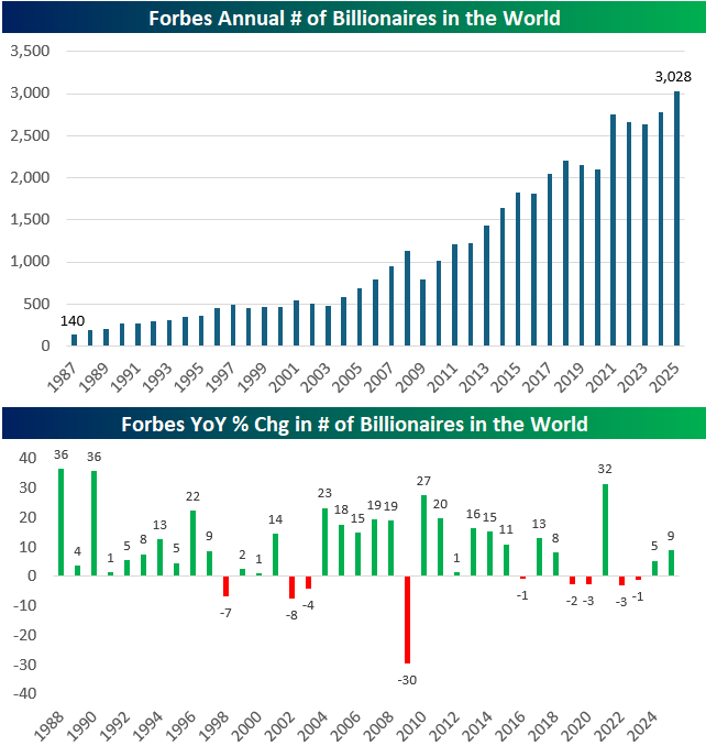 The growth in the number of billionaires over the past four decades is nothing short of extraordinary. Back in 1987, Forbes counted just 140 billionaires globally. As of 2025, that number has surged to a staggering 3,028, a 21x increase. This rise has been largely consistent, interrupted only during periods of financial turbulence. The Dot Com crash in the early 2000s and the Great Financial Crisis in 2009 triggered sharp declines, including a record 30% drop in 2009. More recently, 2022 and 2023 saw modest pullbacks in billionaire numbers, reflecting broader market volatility. But the trend remains unmistakable: billionaire status is becoming more common in an increasingly capital driven world.