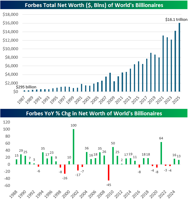 While the number of billionaires has soared, their collective net worth has grown even faster. In 1987, the global billionaire club was worth a combined $295 billion. Today, their net worth has ballooned to $16.1 trillion, more than a 50x increase. The 2009 crash wiped out nearly half of billionaire wealth (-45%), but recoveries have been swift and powerful. For instance, in 2021 alone, billionaire net worth rose by a massive 64% as markets roared back from COVID lows. Even in recent years, with inflation, rate hikes, and geopolitical stress, total billionaire wealth has continued to grow, up 13% in 2024 and another 16% in 2025. It's clear that the billionaire class not only survives economic storms, it often thrives in their aftermath.