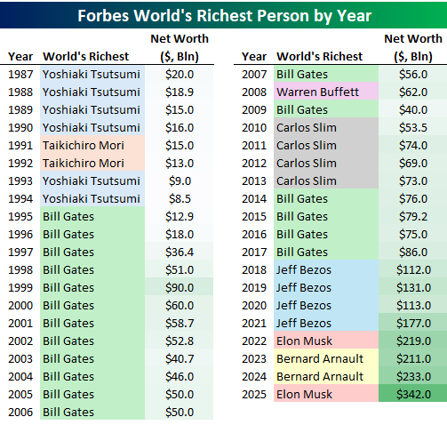 The 2010s saw Carlos Slim ascend amid the rise of telecom and infrastructure in emerging markets. But the real shift came with the tech titans of the 2010s and 2020s: Jeff Bezos led the way during Amazon’s global expansion, and Elon Musk rocketed to the top during the EV and space boom, now commanding a mind-bending $342 billion fortune. The occasional lead by Bernard Arnault, representing luxury goods via LVMH, shows how wealth today isn't just tech-driven, it’s increasingly global, diversified, and tied to brand power, scale, and platforms.