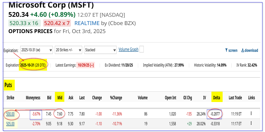 MSFT puts expiring Oct. 31 - Barchart - As of Oct. 3, 2025