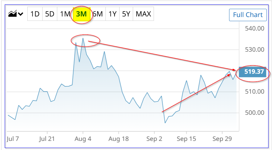 MSFT is at $519.50 in midday trading on Friday, Oct. 3. The stock is up from a recent low of $495.00 on Sept. 5, but it's off from a peak of $535.64 on Aug. 4.