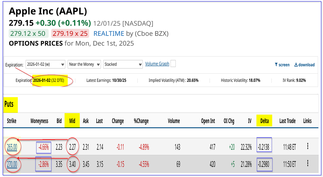 This can now be repeated for the next month. For example, the Jan. 2, 2026, expiry period shows that the $265 put option has a midpoint premium of $2.27, and the $270 put has a $3.40 premium.