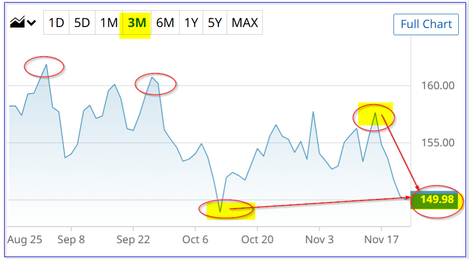 CVX closed at $149.98 on Friday, Nov. 21, 2025, near a recent low of $148.90 on Oct. 10. Moreover, it's well off recent peaks of $160.72 on Sept. 25 and $161.83 on Sept. 2.