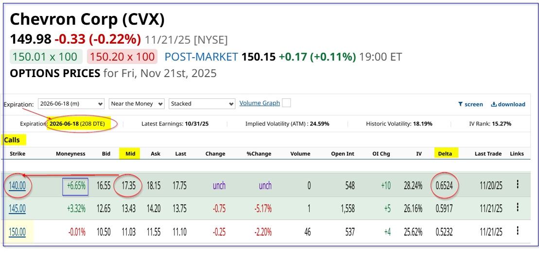 CVX calls expiring 6/18/26 - Barchart - As of 11/21/25