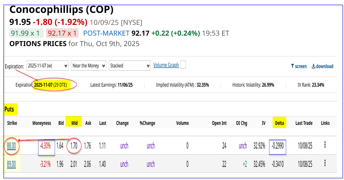 Moreover, the breakeven point, even if COP falls to $88.00 over the next month, is lower (i.e., $88.00 - $1.70 = $86.30). That is -6.14% below Thursday's close. So, it provides good downside protection to the buyer (assuming the account is assigned to buy shares at $88.00).