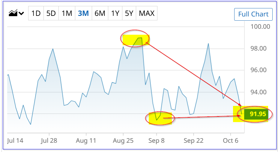 For example, the Nov. 7 expiry period (about a month out) shows that the $88.00 put option contract has a midpoint premium of $1.70 per put contract. This put strike price is 4.3% below the closing price on Oct. 9, i.e., it's out-of-the-money (OTM) and has no intrinsic value yet.