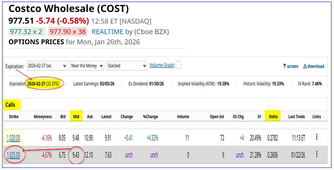 For example, using a covered call OTM call strategy (i.e., assuming COST won't rise much further over the next month), an investor could short the Feb. 27, 2026, $1,025 call option at the midpoint of $9.43.