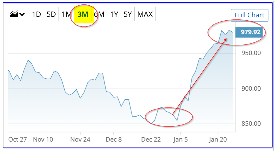 COST stock is at $979.29 in midday trading on Monday, Jan. 26. That's up +12.13% from $873.35 on Dec. 28, when I wrote the Barchart article, “Costco Has Tumbled Despite Higher FCF and FCF Margins - Time to Buy COST Stock?”