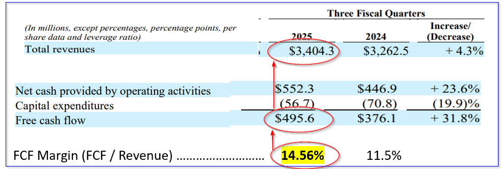 It shows that FCF margins YTD are 14.56% vs. 11.5% a year ago. We can use that to project its free cash flow over the next 12 months (NTM).