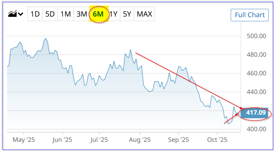 DPZ stock - last 6 months - Barchart - Oct. 17, 2025