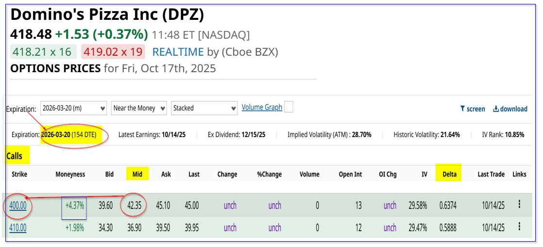 DPZ call expiring March 20, 2026 - Barchart - As of Oct. 17, 2025