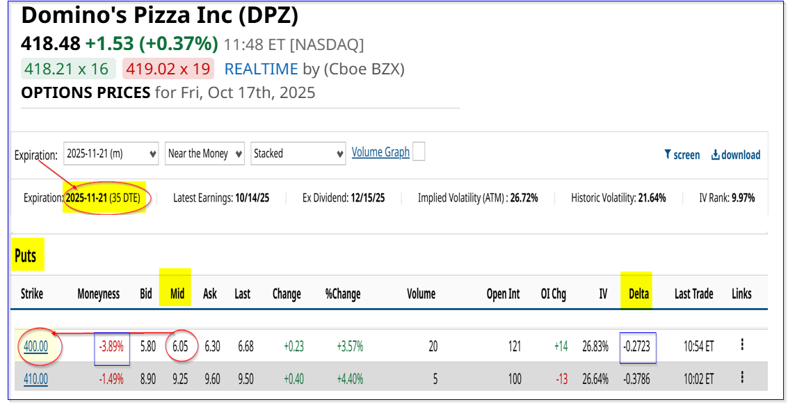 DPZ puts expiring Nov. 21 - Barchart - As of Oct. 17, 2025