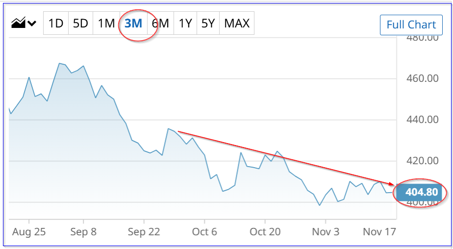 DPZ stock - last 3 months - Barchart - As of Nov. 18, 2025