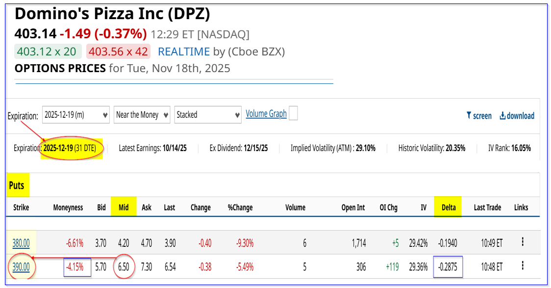 At the time, DPZ was at $418.48 per share, and the $400.00 strike price put contract expiring Nov. 21, 2025, had a $6.05 mid-point premium.