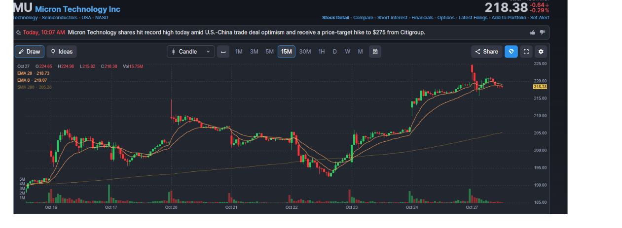 While momentum chasers were piling into Micron (MU) near $209, my 15-minute chart was flashing red. Smart money was taking profits. Algorithmic selling was about to begin.