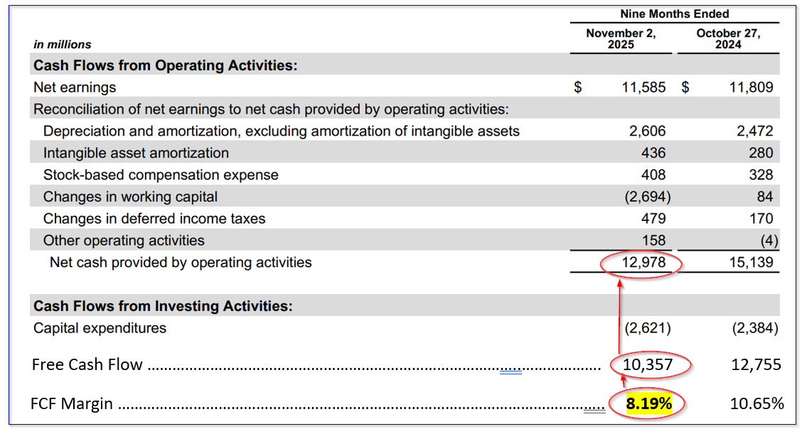 This could be due to higher tariff expenses as well. However, Stock Analysis shows that the company's trailing 12-month (TTM) FCF margin is slightly higher at 8.38% (i.e., $13.927 billion TTM FCF on $166.189 billion in TTM sales).