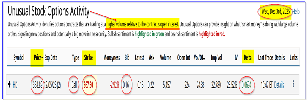 HD calls expiring 12/5/25 - Barchart Unusual Stock Options Activity Report - Dec. 3, 2025