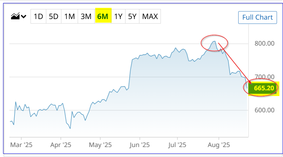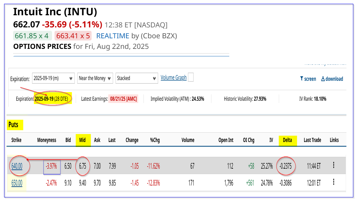 For example, look at the Sept. 19, 2025, expiry period for $640 put option strike price, which is 4% below today's price (i.e., is out-of-the-money or OTM). It shows that the midpoint premium is $6.75.
