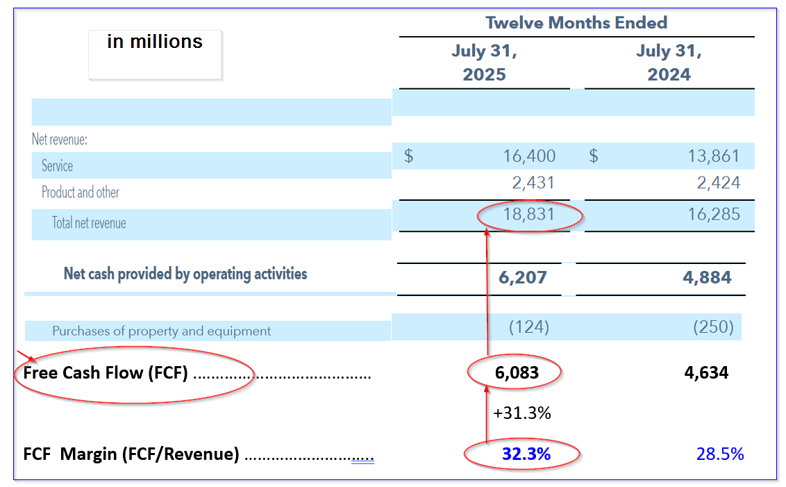 That represents a huge FCF margin of 32.3% of its $18.83 billion TTM revenue. That was significantly higher than last year's 28.8% FCF margin, and in line with prior quarters' LTM data, according to data from Stock Analysis.com.