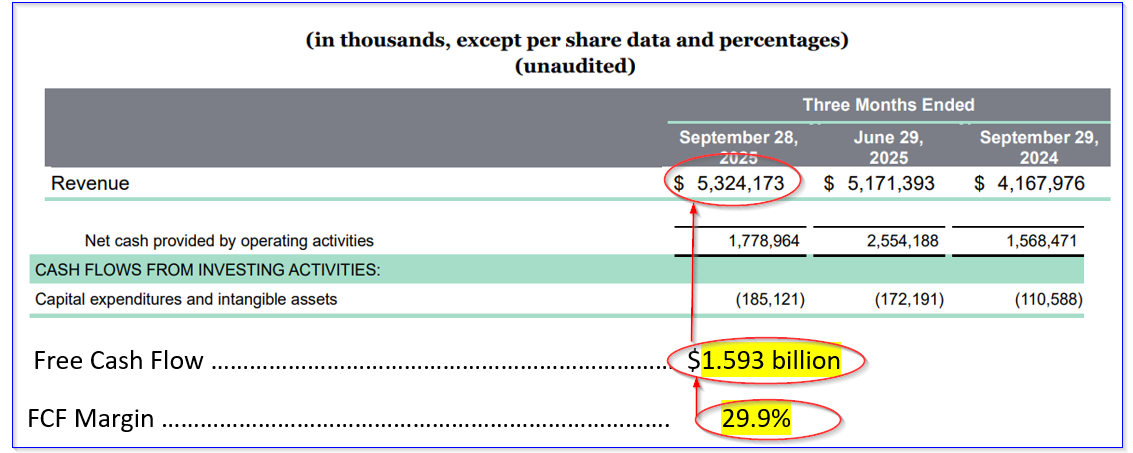 Moreover, its operating cash flow (OCF) margin (i.e., operating cash flow, before capex spending) was $1.78 billion, down from $2.55 billion last quarter, but up +13.3% from $1.57 billion a year ago.
