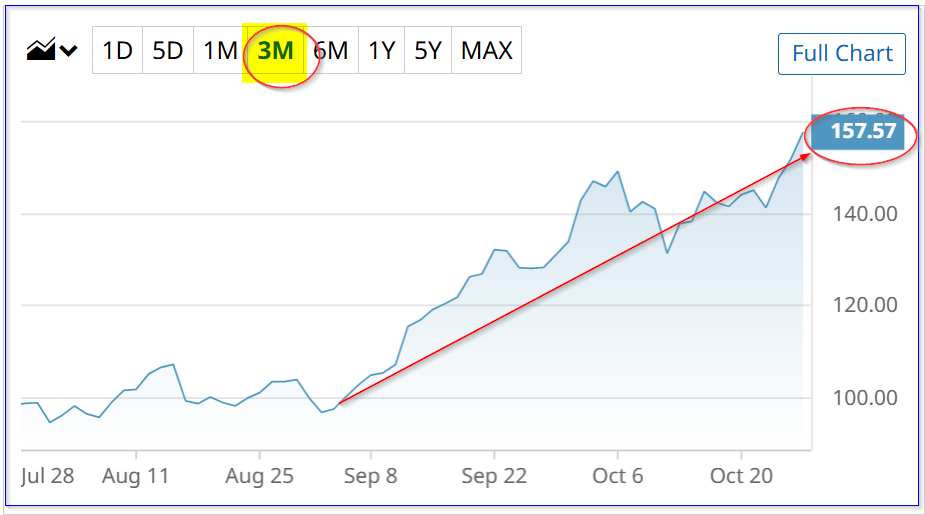 LRCX is at $156.31 in midday trading on Monday, Oct. 27, with a market capitalization of $197.2 billion according to Yahoo! Finance. The stock has been on a tear in the last 3 months, and should have more to go, as we will see below.