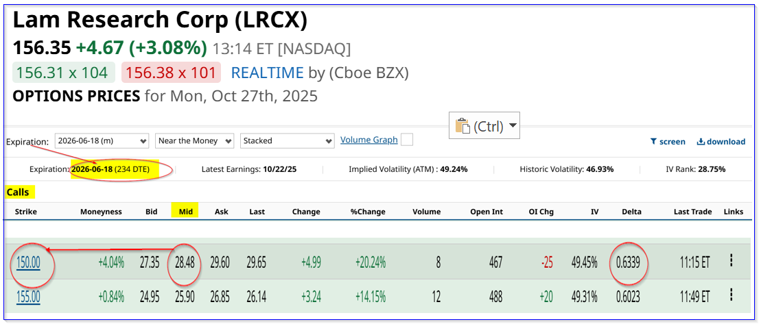 For example, the $150.00 calls expiring June 18, 2026, 234 days or over 7 months from now, have a midpoint premium of $28.48 per call contract.