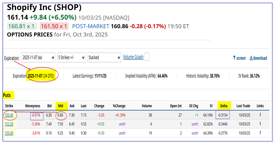 For example, the Nov. 7, 2025, option expiration period (approximately a month away) shows that the $150.00 put strike price has a midpoint premium of $6.80 per contract.