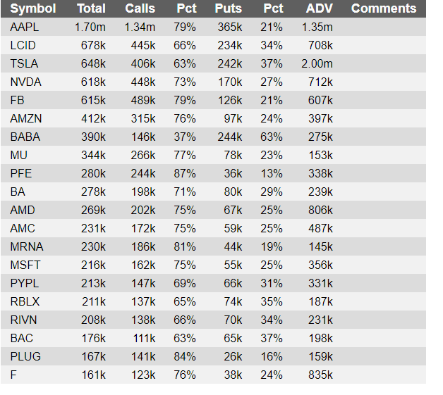 Top Tickers: AAPL, LCID, TSLA, NVDA, FB, AMZN, BABA, MU, PFE, BA, AMD, AMC, MRNA, MSFT, PYPL, RBLX, RIVN, BAC, PLUG, F.