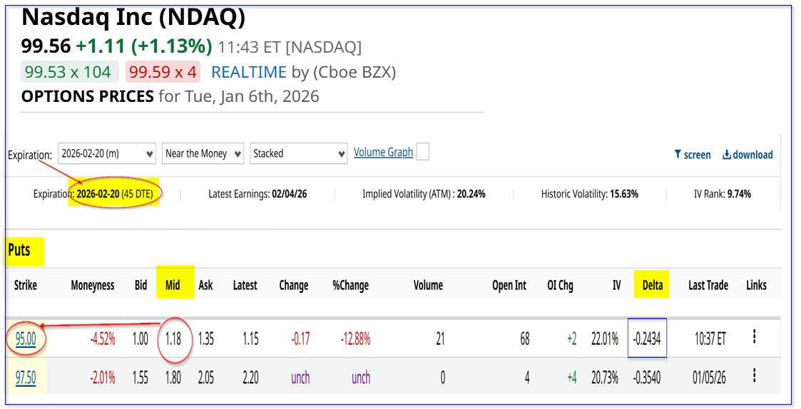 NDAQ stock has options only available once per month. So, the upcoming Jan. 16, 2026, expiration period (10 days to expiry or DTE) shows that the $95.00 strike price put option has a $0.28 midpoint premium.
