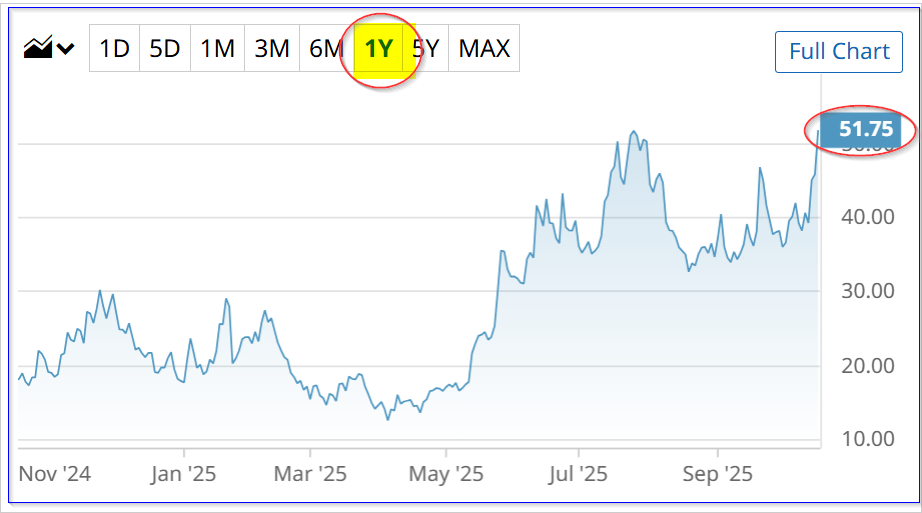 SMR is at $51.24 today, up $5.81, or +11.8%. This is a 52-week high for SMR stock.