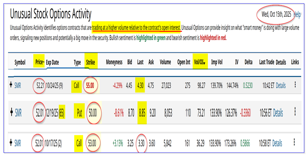 SMR calls and puts with heavy volume - Barchart Unusual Stock Options Activity Report - Oct. 15, 2025