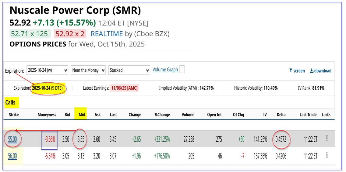 It shows that over 27,000 call options expiring in 9 days on Oct. 24 have traded at the $55.00 strike price, i.e., out-of-the-money (OTM). The midpoint premium is $4.30, indicating that buyers of these calls may believe that SMR could rise to $59.30 by then (i.e., up +15.7% from today).