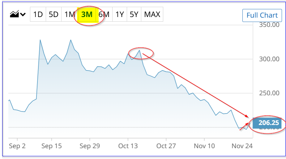 ORCL stock is at $205.21 today, up $8.18, or +4.15% after hitting a recent low of $197.03 yesterday. This is after a recent peak of $313.00 on Oct. 16.