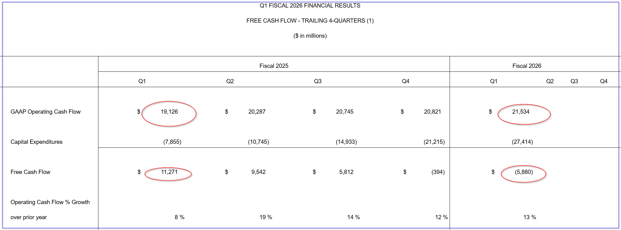 That $8.5 billion completely ate up the $8.14 billion in Q1 operating cash flow, leaving FCF in Q1 of -$362 million.