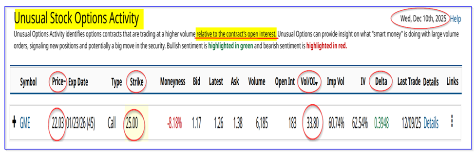 GME calls expiring Jan. 23, 2026 - Barchart Unusual Stock Options Activity Report - Dec. 10, 2025