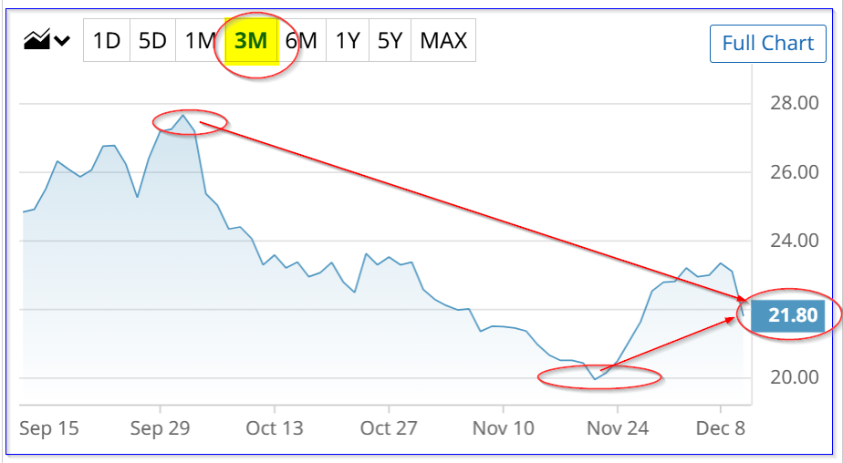 GME is down today, trading at $21.75 per share, up from a recent low of $19.94 on Nov. 20. Nevertheless, GME is still well off its recent closing peak of $27.69 on Oct. 1.