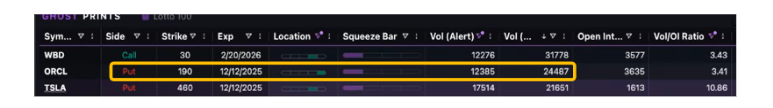 24 hours before Oracle's earnings, someone bought 24,000 puts at exactly one strike: $190.