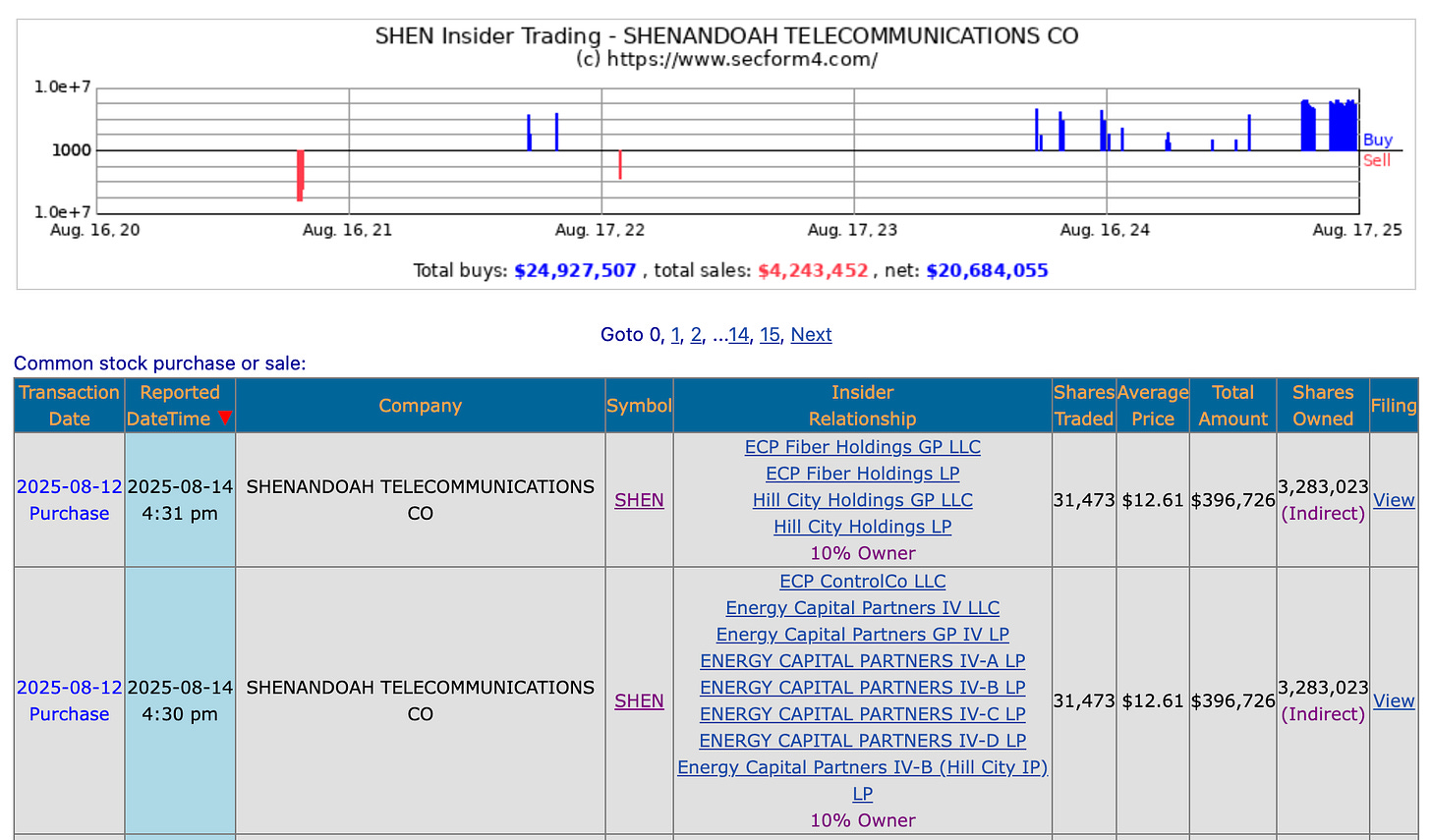 Also, if you’re looking for a stealth play on the fiber, see Shenadoah (SHEN) as an insider darling. It’s not big. It only boasts $686 million in market capitalization, but insider money is seemingly flooding into it through the back door. Kudos to Scott Dunn, who works with me, for picking up on this.