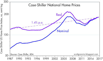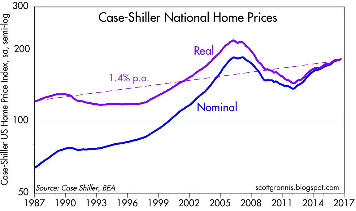 1. The first of the charts above shows indices of real and nominal national home prices since 1987, according to Case Shiller.