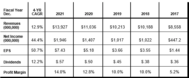 PulteGroup generated healthy growth during the past five years with revenues, net income, EPS, and dividends compounding at double-digit rates. During the past decade, Pulte has focused on delivering industry-leading returns on equity (ROE), launching a series of important changes including land acquisition criteria and new approaches to land development and home construction processes. Over the past five years, Pulte’s ROE has averaged a profitable 20%, rising to 26% in 2021.