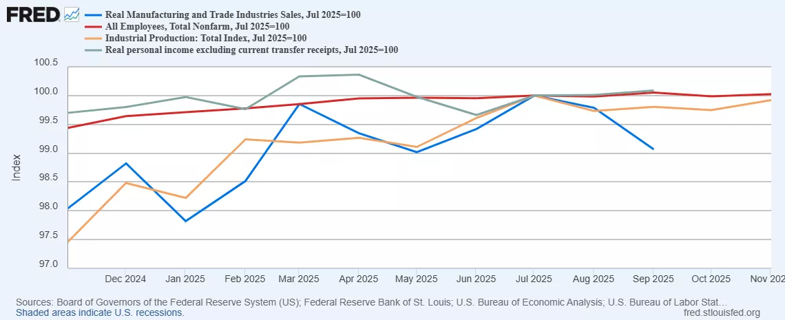 Let me start by reporting a link to a graph I put up last Friday , which norms nonfarm payrolls, industrial production, real manufacturing and trade sales, and real income less government transfers to 100 as of July. As I noted then, only two of the four - real income and payrolls - exceeded their July readings only once, in September, by 0.1%. All other readings since July have been either flat or down, with several not updated yet since the shutdown. In general the four series, taken together, have been largely stagnant since March or April: